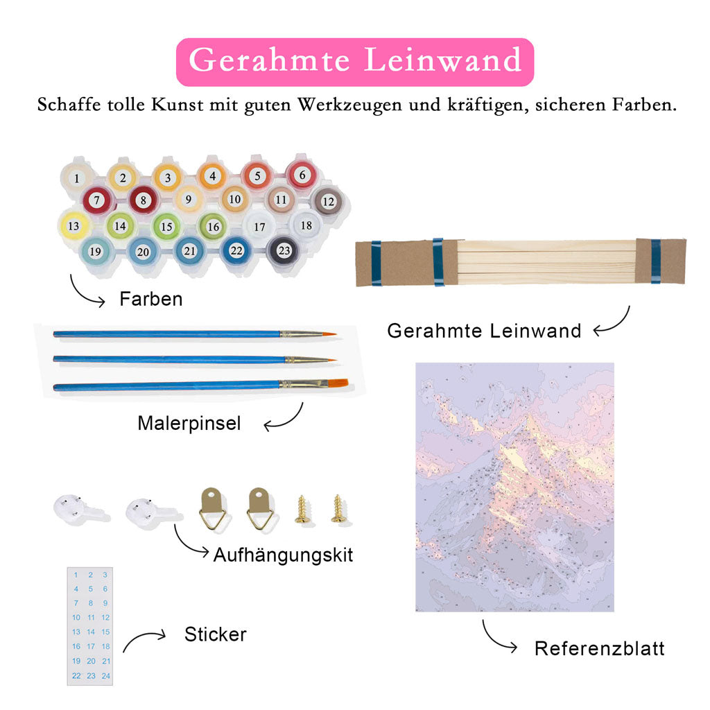Malen nach Zahlen erfordert keinerlei Vorkenntnisse. Alles, was Sie tun müssen, ist den Anweisungen zu folgen und den kreativen Prozess zu genießen, um Ihr eigenes Kunstwerk zu schaffen.