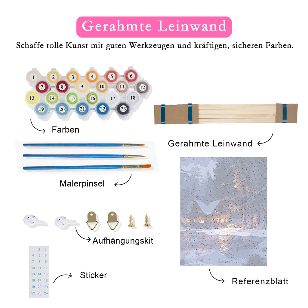 Erschaffen Sie eine Szene voller Magie und Gemütlichkeit. Mit diesem Malen-nach-Zahlen-Set malen Sie eine heimelige Holzhütte, deren warmes Licht sich auf dem zugefrorenen Fluss spiegelt. Umgeben von einer tief verschneiten Waldlandschaft, strahlt dieses Motiv eine unglaubliche Ruhe und Wärme aus. Unser Komplett-Set enthält alles, was Sie benötigen, um dieses Winterwunder selbst zu gestalten: eine hochwertige Leinwand, alle Farben und Pinsel.